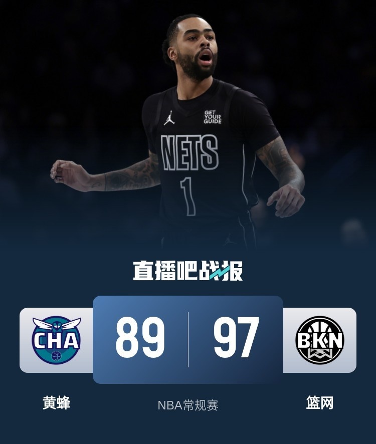 此役一上来双方迅速找到状态,迪亚巴特连投带罚接连取分,但鲍尔仅出战首节便伤退,篮网内外结合强势回应,两队你来我往比分紧咬,首节结束时篮网领先4分,次节回来,黄蜂进攻陷入停滞,篮网延续火力将比分拉开,半场战罢,篮网确立12分优势。易边再战后迪亚巴特连造杀伤罚球止血,无奈队友进攻状态低迷,篮网稳扎稳打牢牢占优,三节结束后篮网已经领先20分,末节上来,黄蜂追分无望提前投子认负,最终篮网97-89赛季三杀对手。
