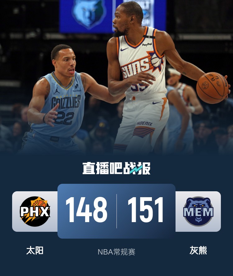 此役一上来双方迅速找到节奏陷入僵持,杜兰特连造杀伤接连取分,波尔扮演奇兵续上火力,小贾伦-杰克逊连投带罚及时回应,首节结束时太阳领先3分,次节回来,两队你来我往继续鏖战,布克和比尔轮番发力,半场战罢,太阳保持4分优势。短暂休整后双方延续进攻手感,比尔连投带传盘活全队,两队外线火热对飚,三节结束后太阳依然领先2分,末节决战,小贾伦-杰克逊六犯离场,双方鏖战至最后时刻,莫兰特高难度三分+抛投连拿5分,杜兰特绝杀未果后进入加时,加时赛太阳一度占优,但韦尔斯突然爆发连续取分,灰熊一波7-2奠定胜局,杜兰特绝平三分不中,最终灰熊151-148逆转对手。