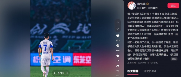 2月12日讯 陶强龙更新社媒,告别武汉三镇俱乐部。