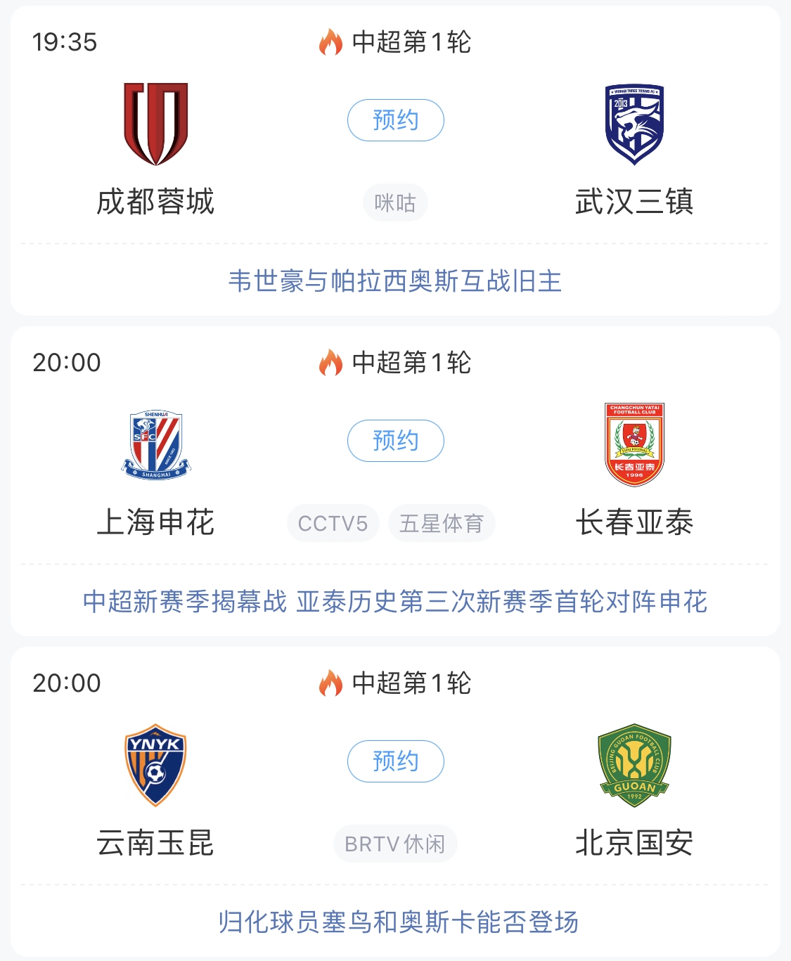 今晚,2025赛季中超联赛就将拉开帷幕!上海申花承办开幕式,主场迎战长春亚泰;球市火爆的成都蓉城迎战武汉三镇;中超新军云南玉昆坐镇玉溪高原主场迎战国安,万众瞩目的塞鸟和奥古楼能否亮相?